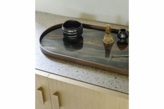 Organic movement meets linear shapes in the Linear Flow tray collection. This Bronze Organic glass tray is inspired by the ink drawings at the beginning of the design process, when the pigment hits the glass it takes on a remarkable life of its own. Complementary effects are revealed in unexpected ways, where hand sketched and painted linear patterns generate a truly distinctive finish.