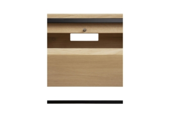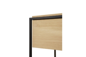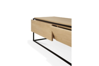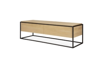 The contrasting characteristics of wood and rectangular metal frame create a unique backdrop for all modern media equipment in the Monolit TV cupboard by Ethnicraft. This unit features one flip-down door and one functional drawer.