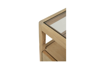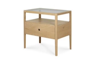 The Spindle collection by Ethnicraft takes its inspiration from the traditional spinning wheel. The Spindle bedside has slightly tapered legs and rounded edges add a soft, sensual quality to this beautiful bedroom collection. This bedside table has one drawer and features a glass inlay top.