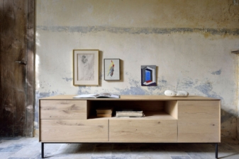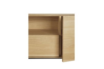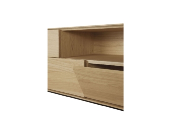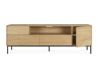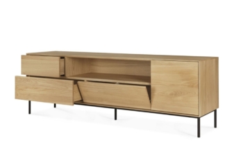Combining soft round legs and eye-catching graphic lines, the Whitebird TV cupboard features one door, one flip-down door and two drawers.