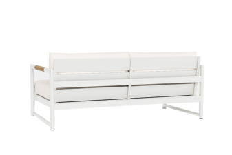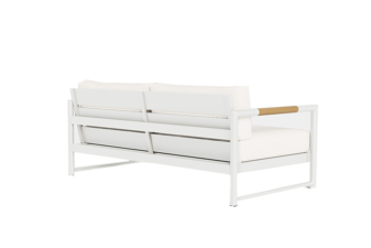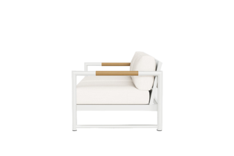 Its appealing simplicity blends a powder coated extruded aluminum frame with an aluminum slatted suspension, plus solid teak arm inlays that keep the armrest cool. Concealed aluminum slatting supports the sit and allows for proper flow–through of the elements. 1 seat cushion and 2 box back cushion included. Resistant to outdoor mildew, stains and fading.