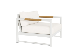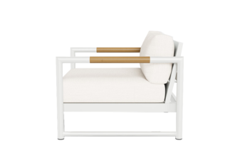Its appealing simplicity blends a powder coated extruded aluminum frame with an aluminum slatted suspension, plus solid teak arm inlays that keep the armrest cool. Concealed aluminum slatting supports the sit and allows for proper flow–through of the elements. 1 seat cushion and 1 box back cushion included. Resistant to outdoor mildew, stains and fading.