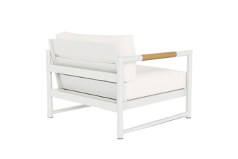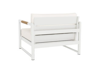 Materials: Handcrafted aluminium frame with powder coating and solid Indonesian teak inlays in the arms for weather resistance. Quick dry flow–through foam seat cushion with Sunbrella fabric features a Dacron wrap for sink–in comfort. Back cushion is filled with Dacron.