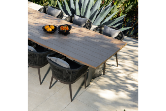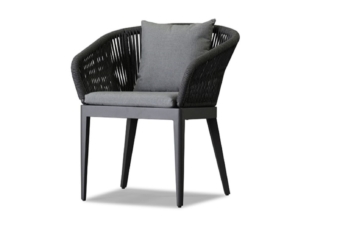 The Hamilton Dining Chair by Harbour Outdoor pairs clean lines with practical design, and is all about contemporary style and comfort — featuring an extruded aluminum base with tapered legs, a sculptural contoured back rest and double–layered woven rope accents.