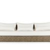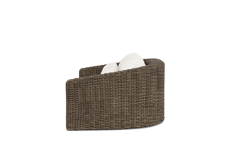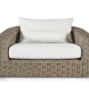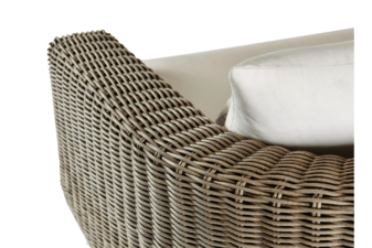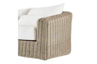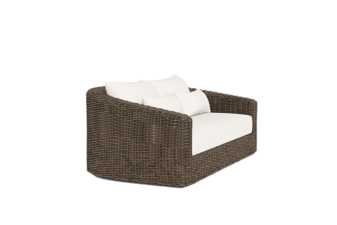 The Barcelona 2-seater sofa features a plush cushion with knife–edge back and lumbar cushions, all handcrafted from all–weather wicker in taupe woven on an aluminum frame. A gentle curved back defines and modernizes the collection. Offering a fresh take on a timeless material, this generously scaled piece will bring contemporary woven style and comfort to your outdoor space.