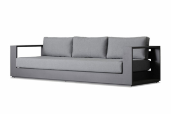 Defined by wide arms and a low–profile, the Hayman 3-seater sofa was designed for ultimate relaxation with a deep bench cushion supported by a Batyline sling suspension for added comfort, all crafted in a powder coated extruded aluminum frame. Indoor comfort meets outdoor performance with this geometric piece made for a variety of spaces.